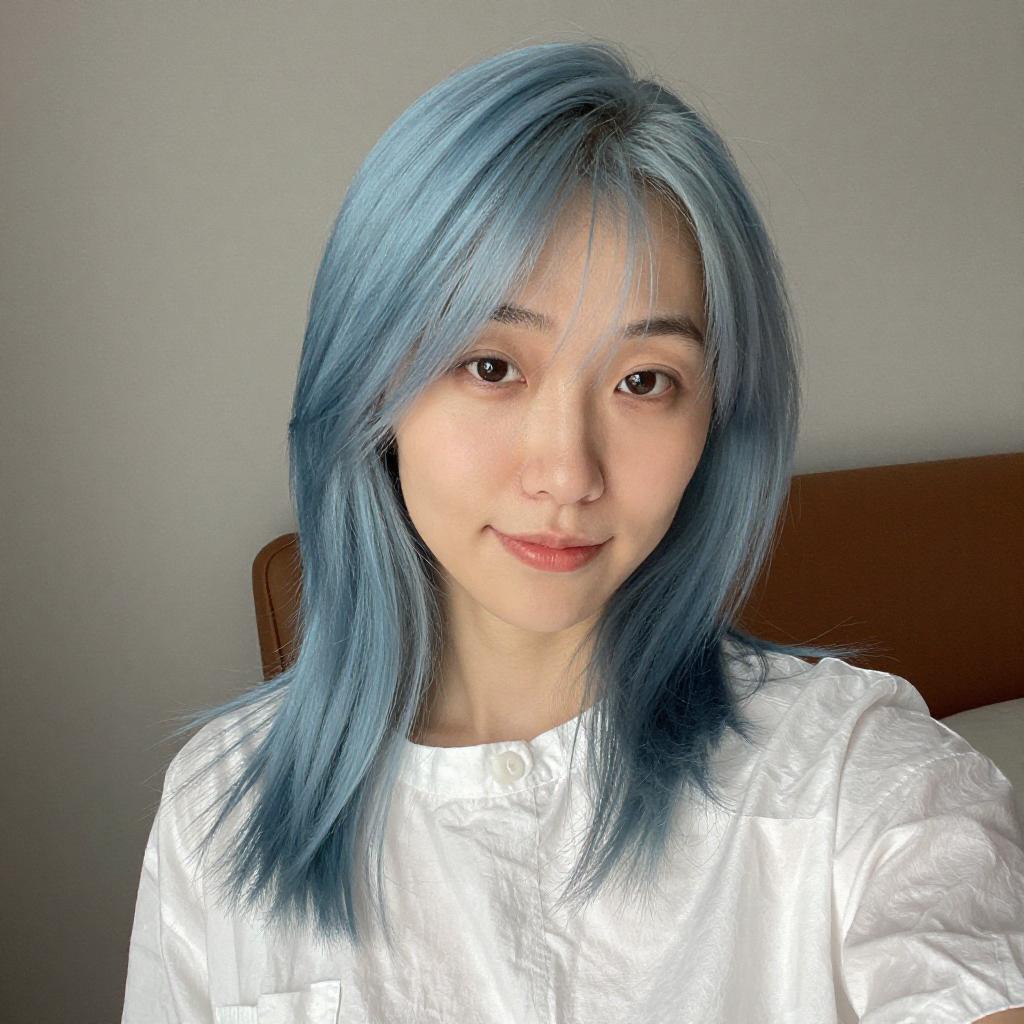 Photograph of an Asian woman with light blue, shoulder-length hair and bangs, wearing a white, long-sleeved blouse. She is taking a selfie with her right arm extended, smiling slightly. The background shows a gray wall and a brown, curved headboard. Soft, natural light illuminates her face and hair.