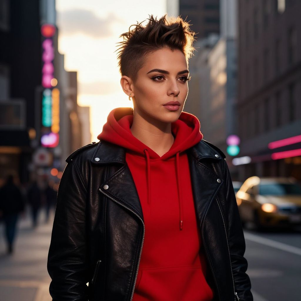 Caucasian woman with Faux Hawk hairstyle, gender-fluid edgy aesthetic, daring fashion mix, red scarf and oversized hoodie, standing in a graffiti-covered alley, neon reflections, high energy, street art vibe, dramatic shadows, Dall-E 3 style.