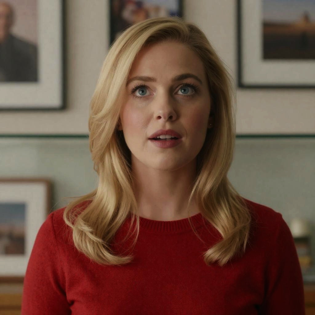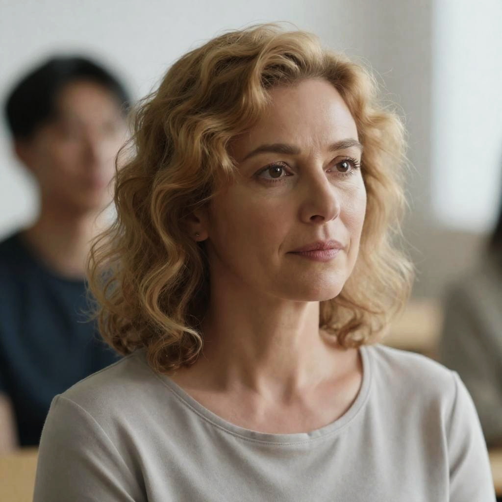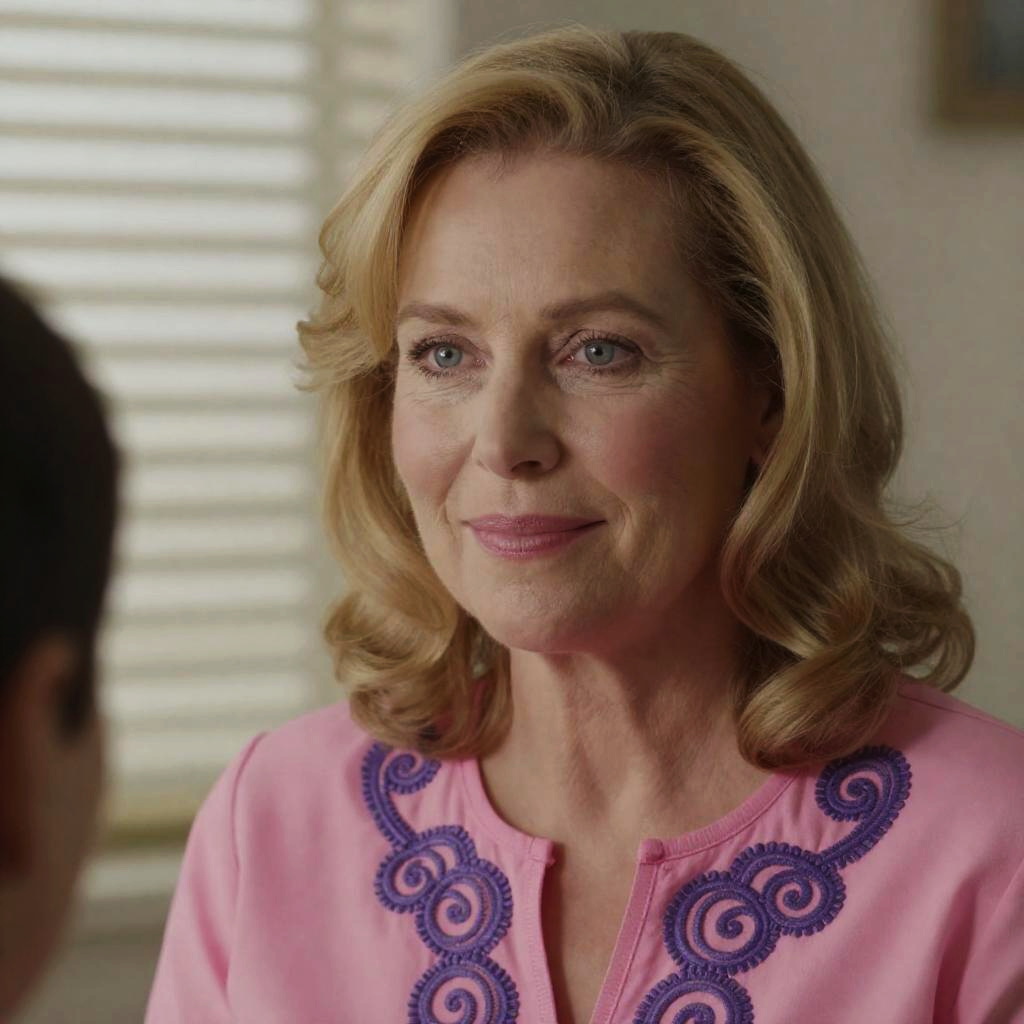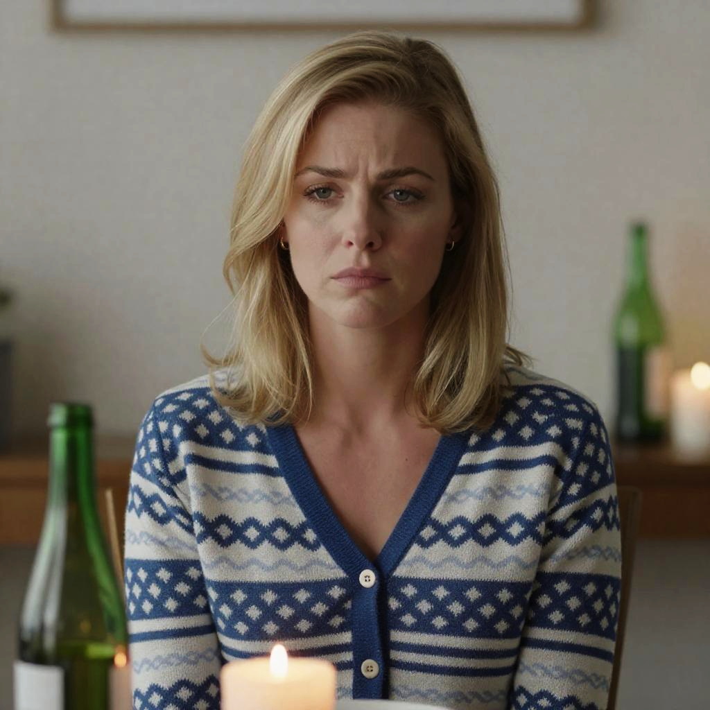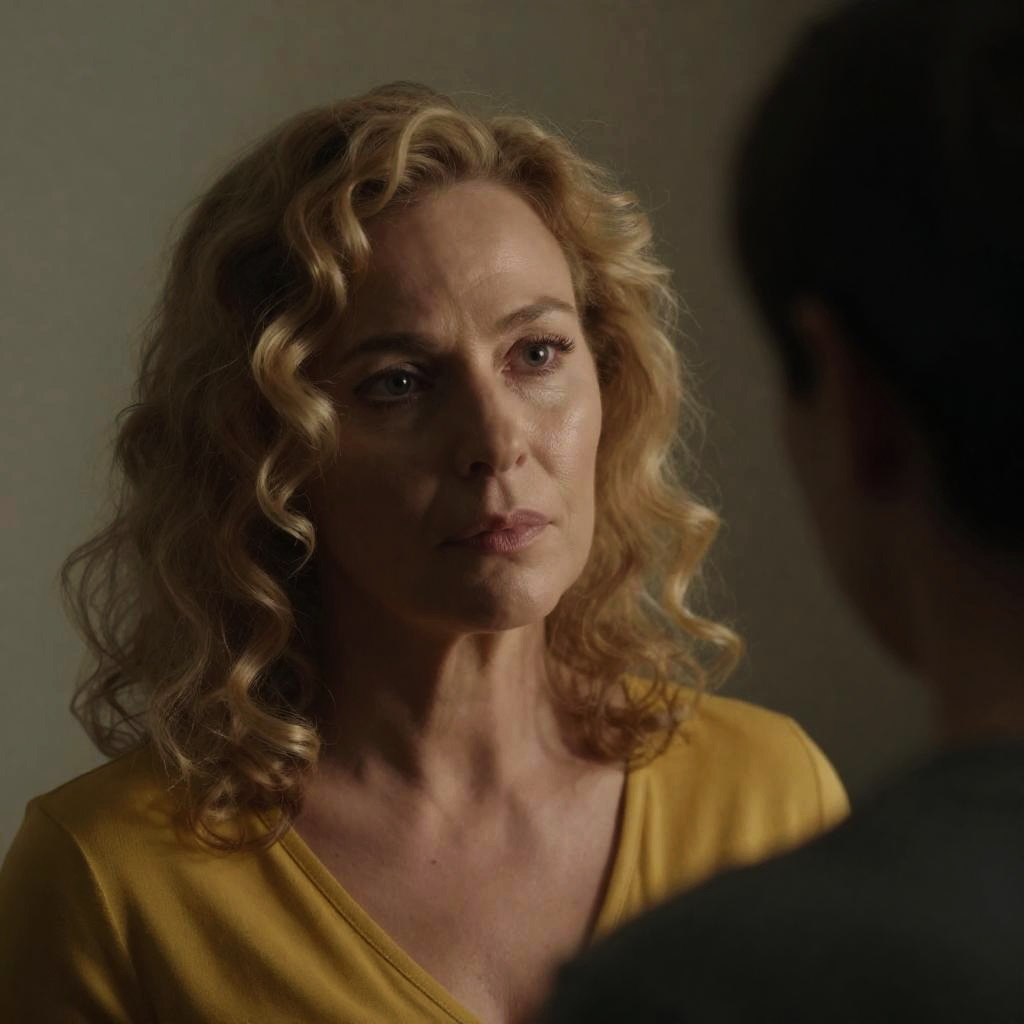 Photograph of a middle-aged blonde woman with wavy hair, wearing a ruffled gray sleeveless top and gold necklace. She holds a toothpick in her mouth, looking to the side with a neutral expression. Wooden door and bottle on table in background. She is seated at a table, with her arms resting on it.