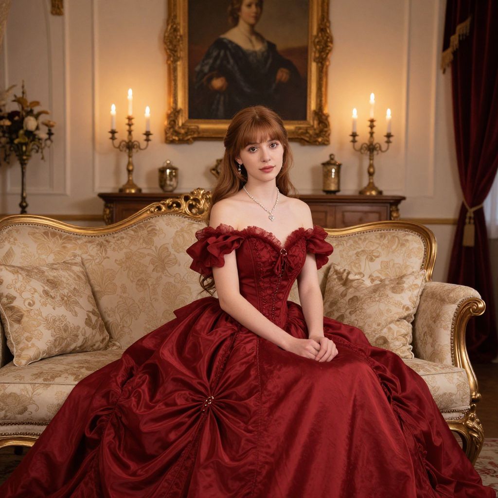 Photograph of a young woman with fair skin and long auburn hair, sitting on an ornate, gold-framed beige sofa in a luxurious room. She wears an off-the-shoulder, rich burgundy, Victorian-style gown with intricate lace and ruffles, and a delicate necklace. The background features a golden-framed portrait of a woman, two lit candelabras, and dark red curtains. The room has a warm, ambient light, enhancing the opulent decor and the subject's poised, elegant appearance.