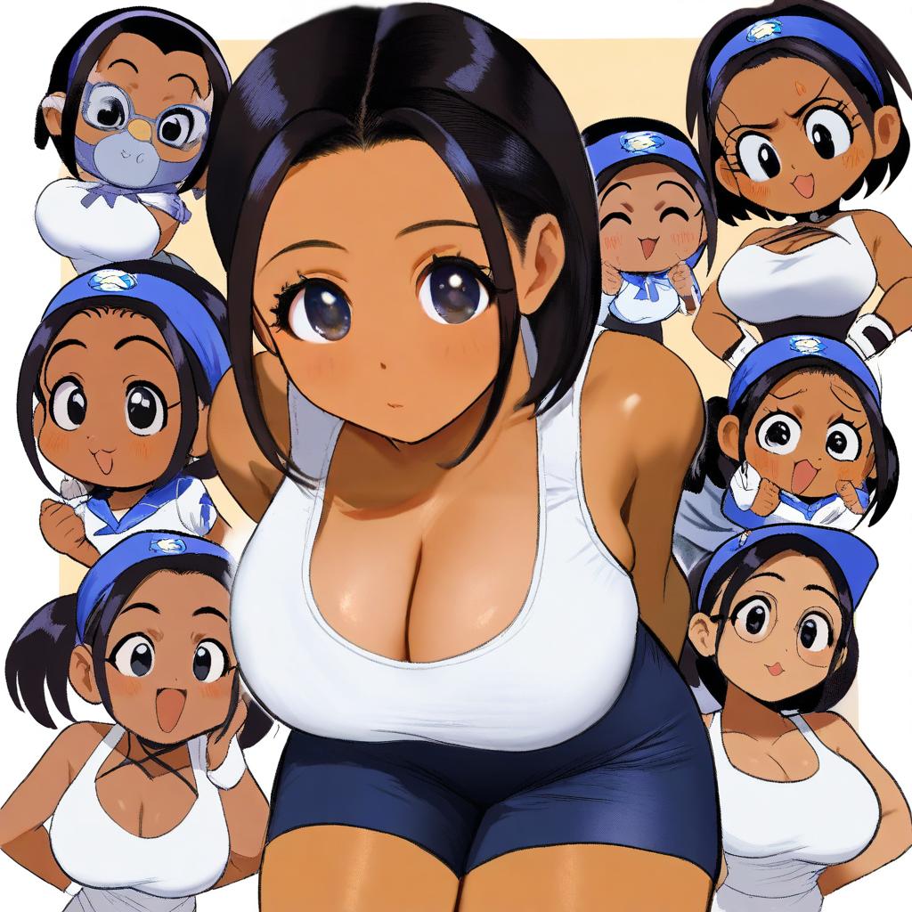 Arung samudra (cessa), ombok diving and delivery services, 1girl, dark-skinned female, black eyes, black hair, short hair, large breasts, cleavage, by artist zunkome, animagine
