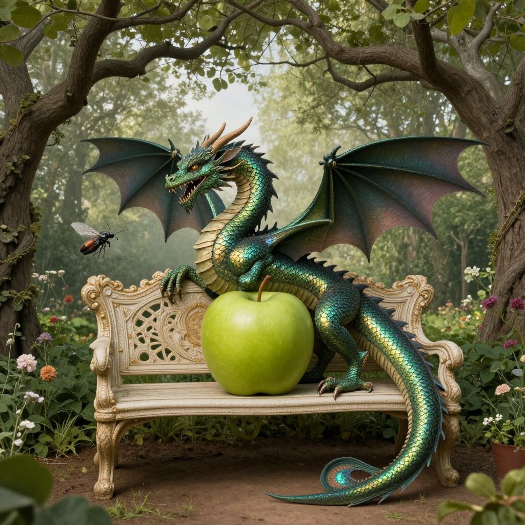 Digital fantasy artwork: Green, iridescent dragon with black wings lounges on ornate white bench, clutching oversized green apple, surrounded by lush