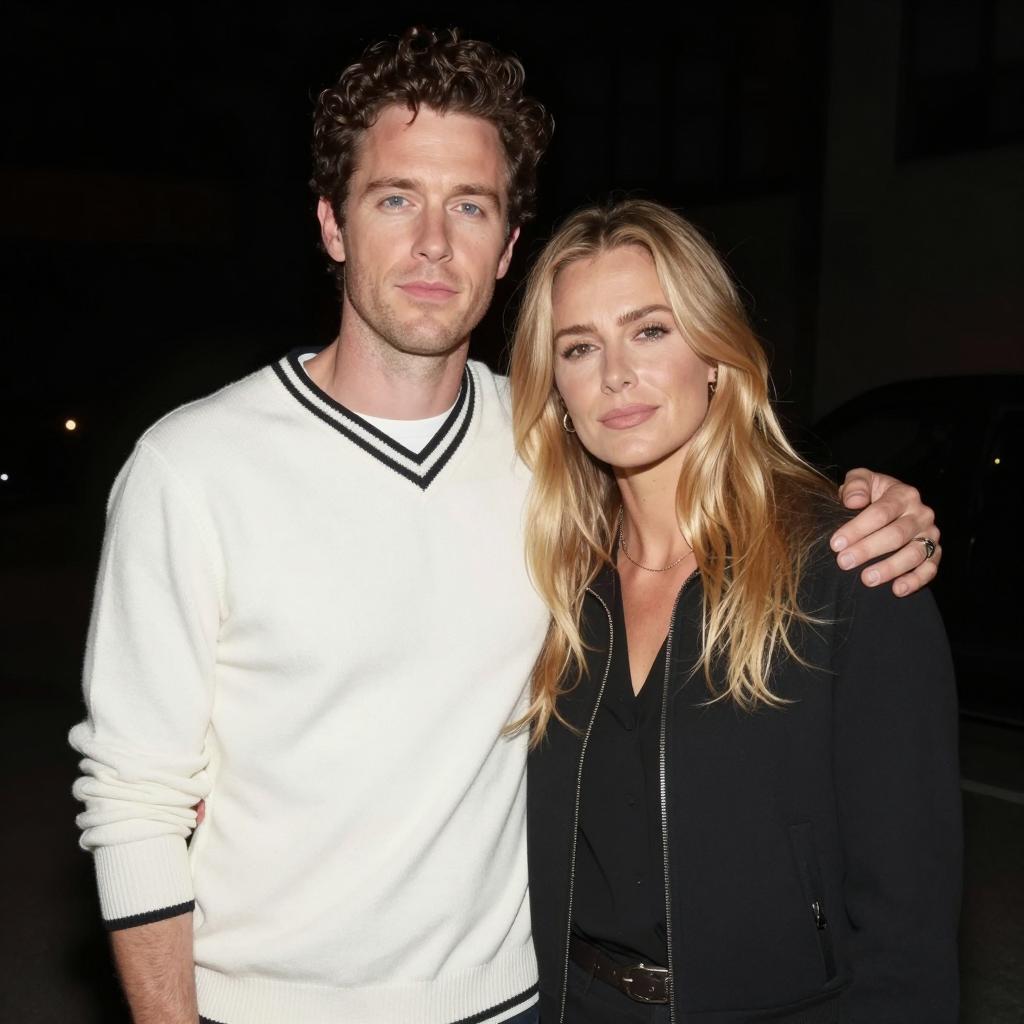 Photograph of a man and woman on stage. The man has short, messy brown hair, wearing a black shirt, smiling. The woman has long, wavy blonde hair, wearing a red strapless dress, smiling. Microphone on the left. Background has blurred stage lights and drums. Both standing, facing forward.