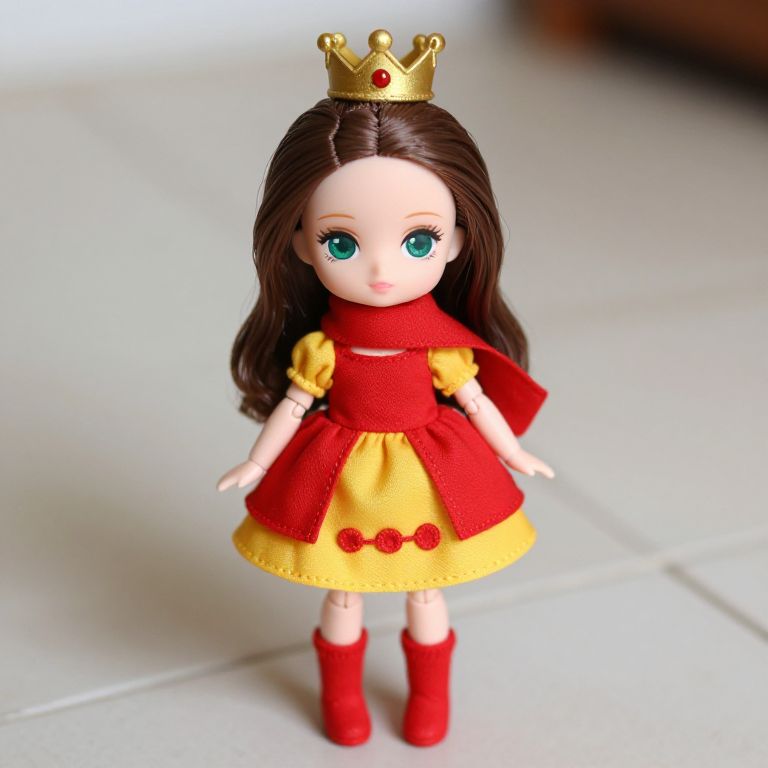 Female doll with braids in her hair, wearing a black and white dress with a white collar and a black bow.