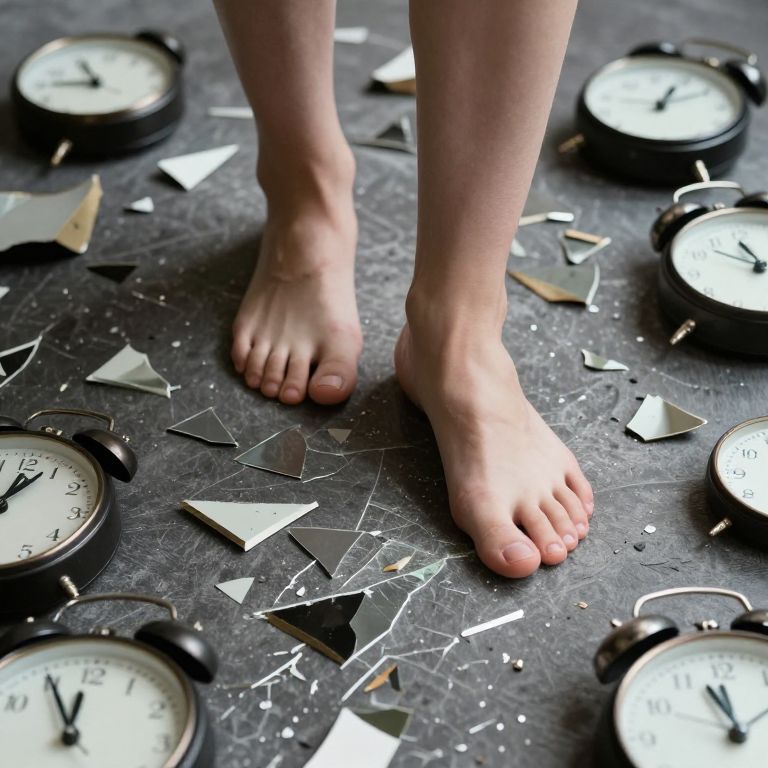 Bare feet tread delicately across a fractured landscape of broken clocks, where shards of time scatter like fragments of a shattered dream.
