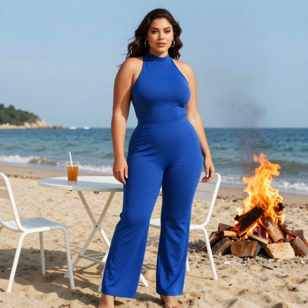 A stocky woman in a modern chic royal blue jumpsuit with a high neckline and wide-leg trousers stands confidently at a seaside table with a beach bonfire, embodying the vibrant visual style of NBM graphic novels. Sexy. Pretty face and beutiful eyes