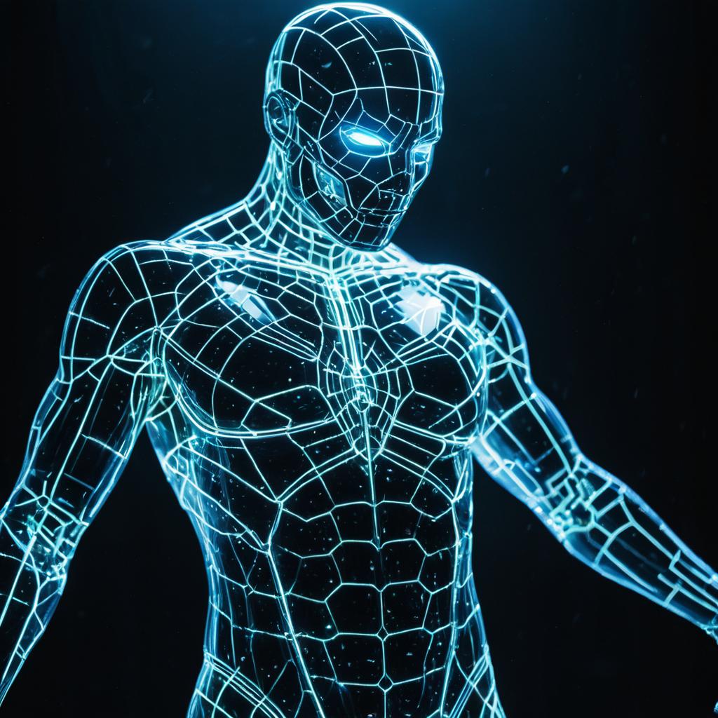 Ultra-detailed illustration of the light silhouette of a android dancer, phantasmagorical figure, (translucent skin:1.6), (translucent body:1.5), neon light, bioluminescent veins glow, backlit, cyberpunk, soft natural volumetric cinematic perfect light, (chiaroscuro:1.4), ghost, motion blur, (ultra wide angle:0.8), fragmented body parts as mosaic fragmentation of body, spheres breaking off face, bleeding, mechanical fragmentation, high detail, floating parts, 8k, octane render masterpiece, masterpiece scale, beautiful depth of field, ultra wide field, ultra detailed CG perspective, ultra dynamic lighting, amazing shadows, vibrant colors, dramatic lighting, atmospheric