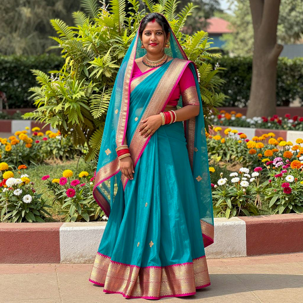 Teal blue lehenga, photograph of a beautiful Indian woman, standing in a colorful flower garden, wearing a turquoise traditional saree with pink and gold borders, long veil, dark hair in a bun, red lipstick, looking at camera, bright sunny day, lush greenery and blooming flowers in the background, casual pose, natural light, vibrant colors, daytime, traditional attire, full-body shot