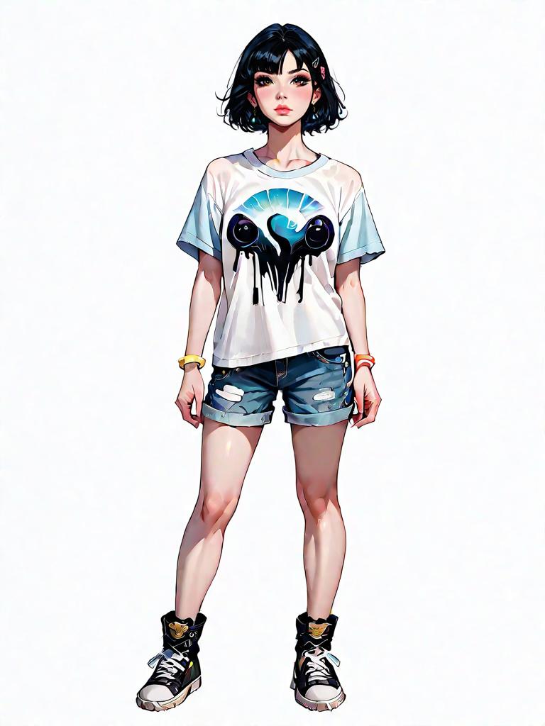Illustration of a young woman with realistic facial features standing in a full body shot. She is wearing a yellow baseball cap with a purple logo, a cropped white t-shirt with a yellow duck graphic, and light green drawstring shorts with side pockets. The background is plain white, highlighting her casual sporty outfit.