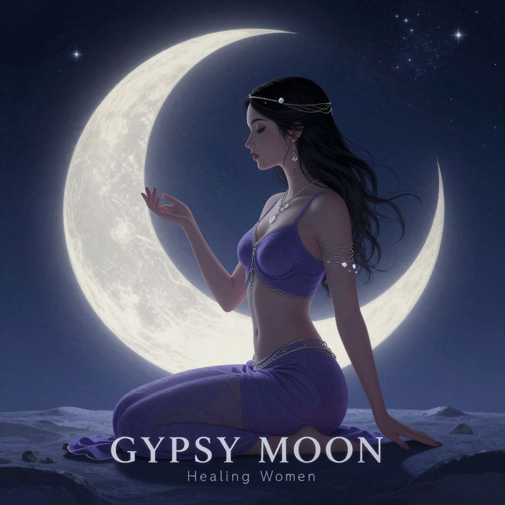 Digital artwork depicting a serene, dark-haired woman with a slim, toned physique and medium-sized breasts, kneeling on a moonlit, rocky surface. She wears a purple, semi-transparent bralette and matching harem pants, adorned with silver chains and jewelry. Her right hand is raised, fingers gently touching her lips, while her left hand rests on the ground. A large, luminous crescent moon dominates the background, casting a soft glow. The night sky is dotted with small stars. The text "GYPSY MOON - Healing Woman" is prominently displayed at the bottom in white, elegant font. The overall style is mystical and ethereal.