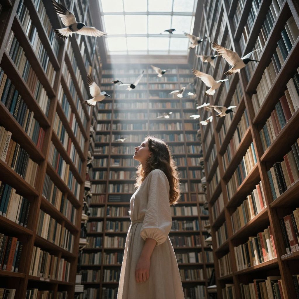 Woman stands amidst towering bookshelves in a surreal library, her gaze fixed on the ethereal flight of birds soaring through the air, as sunlight filters through the ceiling, casting a mystical glow over the scene.