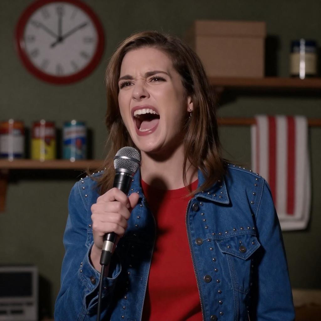 Woman with shoulder-length brown hair, open mouth in a scream, holding a microphone, wearing a blue jacket with silver studs, red shirt. Background: red clock, shelves with boxes, cans, and a striped towel. Dimly lit room.
