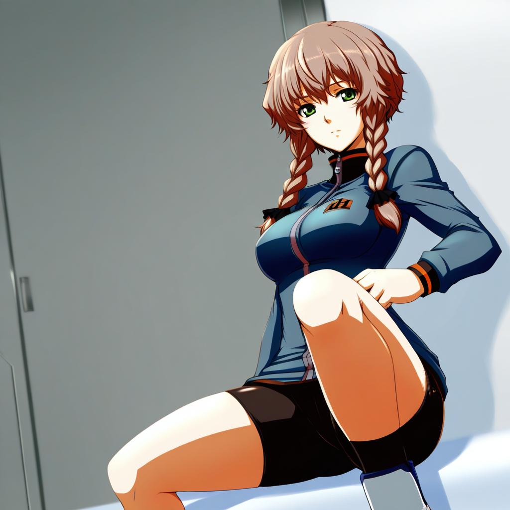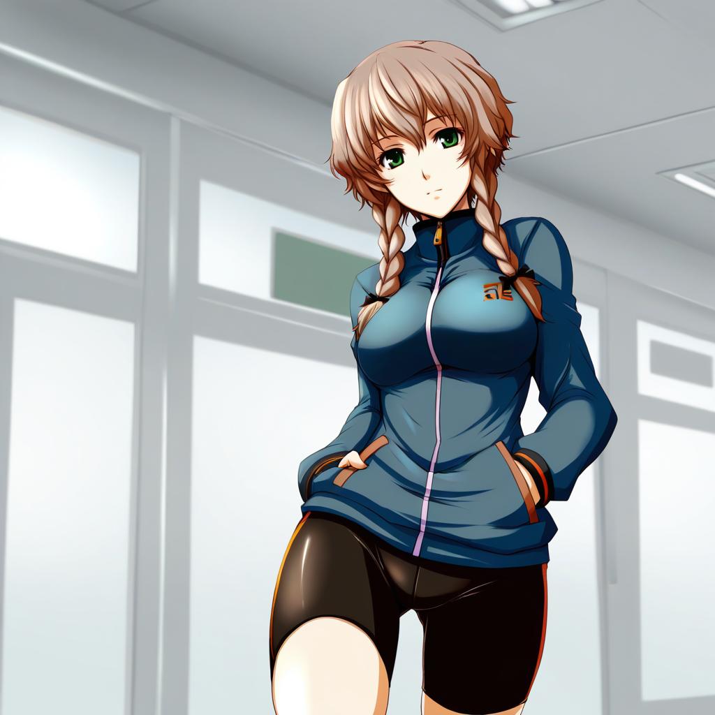 Amane suzuha, steins;gate, 1girl, yellow eyes, green eyes, brown hair, long hair, twin braids, medium breasts, bike shorts, by artist dearmybrothers, illustrious