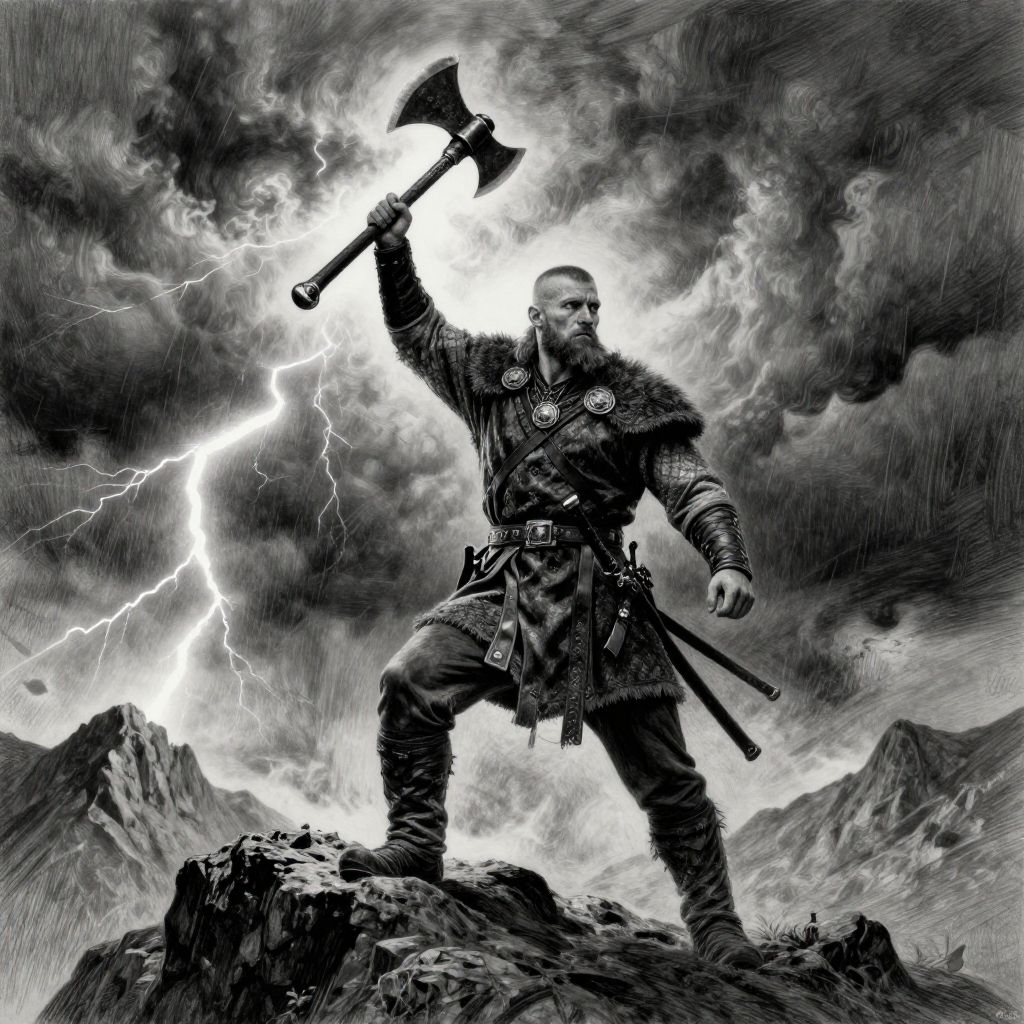 Black-and-white digital drawing of a bearded Viking warrior with armor, holding a glowing axe, standing on a rocky mountain during a lightning storm.