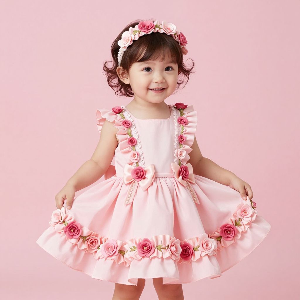 A baby girl with a pink bow on her head is wearing a pink dress with a gold embroidery and pink flowers.