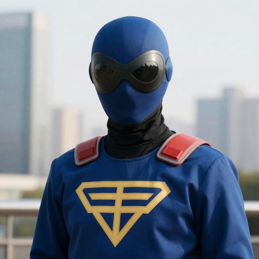 Modern Hero, a close up of a person in a costume with a city in the background