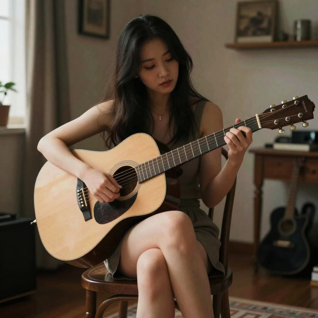 Photograph of a young Asian woman with long black hair, sitting on a wooden chair in a softly lit room. She is wearing a sleeveless, gray dress and is playing an acoustic guitar. Her right hand is on the fretboard and her left hand is on the guitar's body. The room has light-colored walls, a window with white curtains, a small potted plant, and a wooden table with books and a guitar in the background. The floor is wooden, and there is a framed picture on the wall. The woman has a focused expression, and the lighting creates a warm, intimate atmosphere.