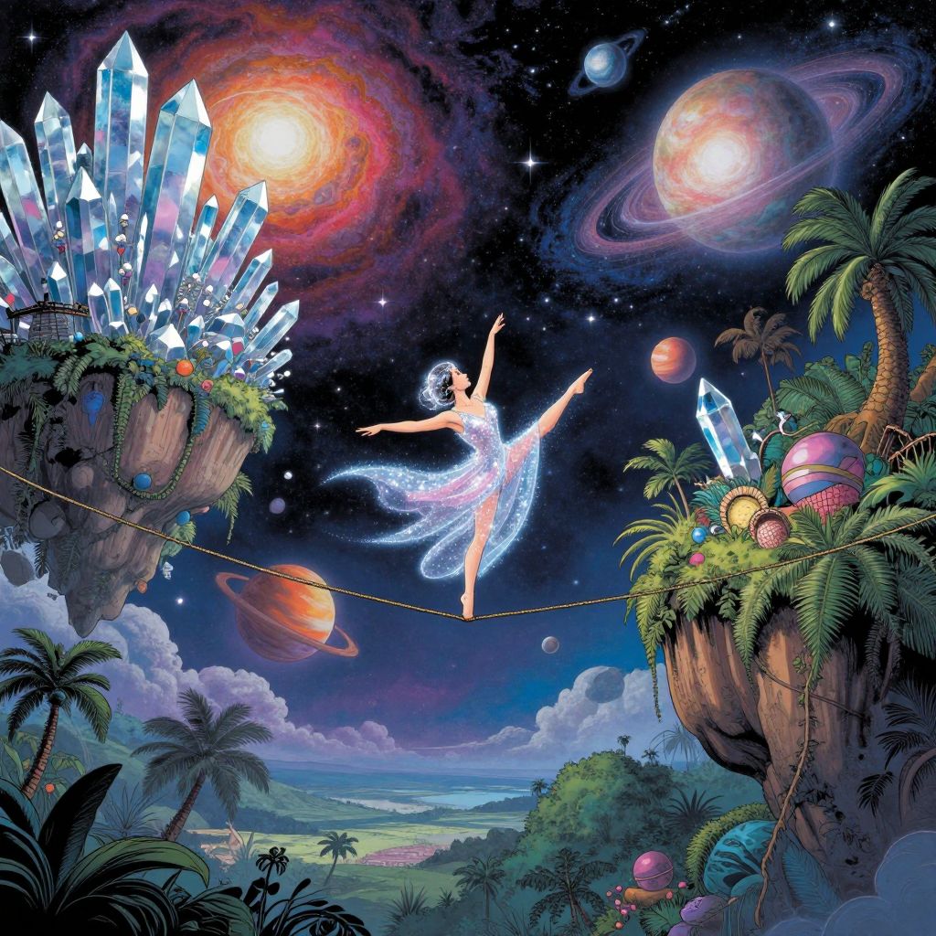 An enchanting scene depicts a celestial performer balancing on a tightrope stretched between two fantastical floating realms, one adorned with crystalline formations that capture the vibrant colors of the cosmic sky above, and the other teeming with an overgrown jungle. The aerialist's costume, woven from shimmering starlight, drapes elegantly as she dances through the heavens with ethereal grace, encircled by a mesmerizing array of planets, moons, and distant galaxies. This whimsical yet profound portrayal, observed from an unconventional perspective that immerses viewers in its celestial wonders, masterfully blends intricate details reminiscent of comic book illustrations with the atmospheric depth and luminous ambiance found in dreamy landscapes, inviting audiences to marvel at the cosmos' beauty and mystery.