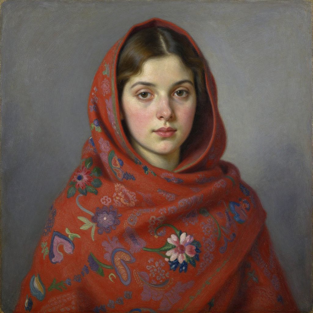 Photorealistic oil painting of a young woman with fair skin, brown eyes, and dark hair, wearing a red floral-patterned headscarf,