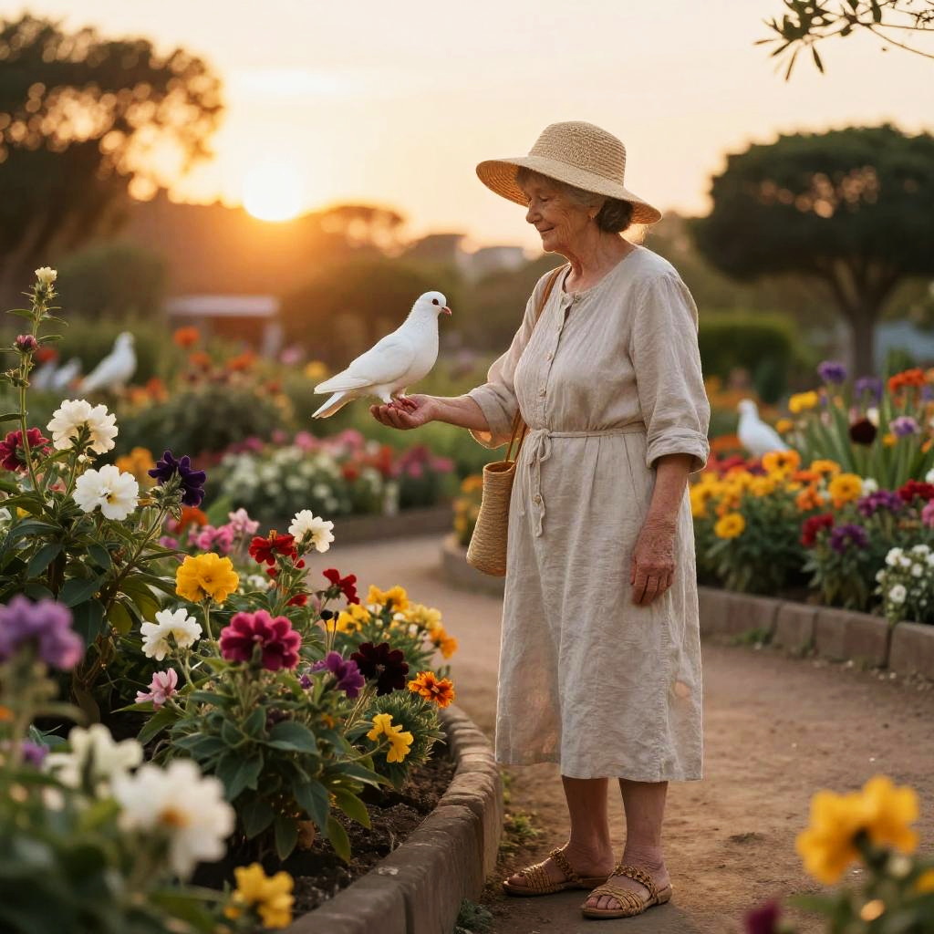A elderly woman in a wide-brimmed sun hat and linen dress wearing woven wicker sandals explores a vibrant garden filled with colorful flowers at sunset. A playful white dove perched gently on her hand accompanies her, adding charm to the scene.