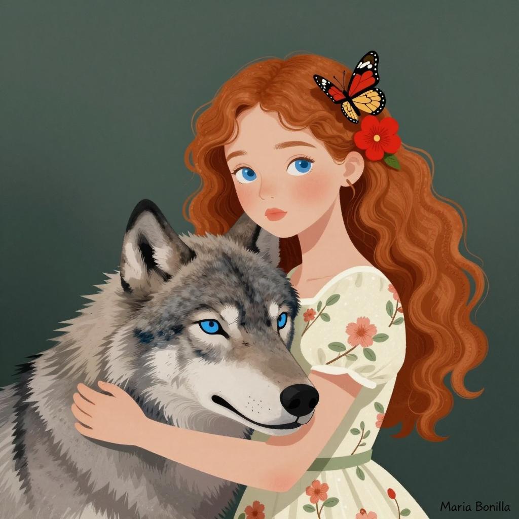 Illustration of a woman with black curly hair, wearing a gold and floral-patterned dress, hugging a large grey wolf. Her eyes are closed, head resting on the wolf's head. The wolf's eyes are yellow, looking forward. Background is colorful with abstract floral patterns. Woman's right hand rests on the wolf's neck. Watercolor and ink style.