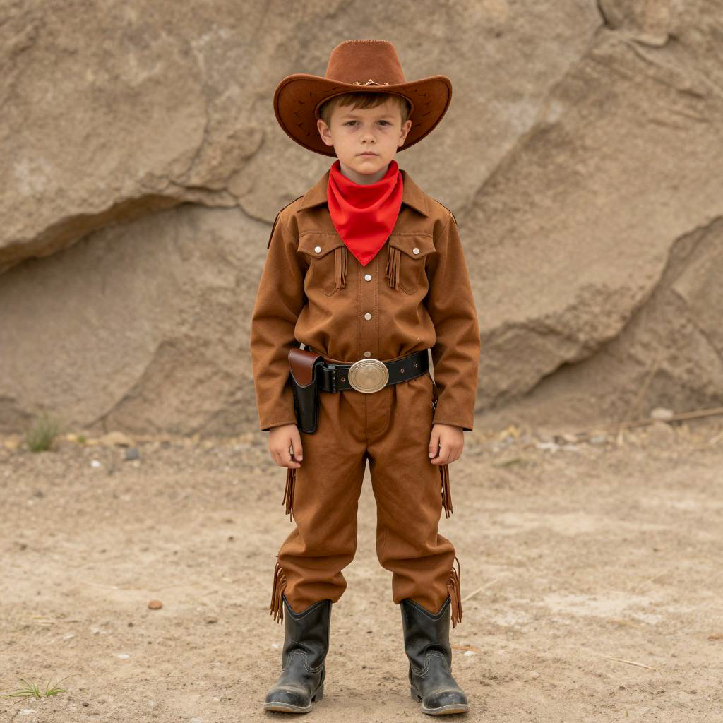 Kid rawhide cowboy costume, photograph of young boy in cowboy outfit, standing on dirt path, brown cowboy hat, red scarf, brown long-sleeve shirt and pants with fringes, black belt with holster, black boots, beige rock wall background, daytime, realistic style, natural lighting, boy centered in frame, neutral expression, slight shadow under hat, earthy colors, western attire, vintage look