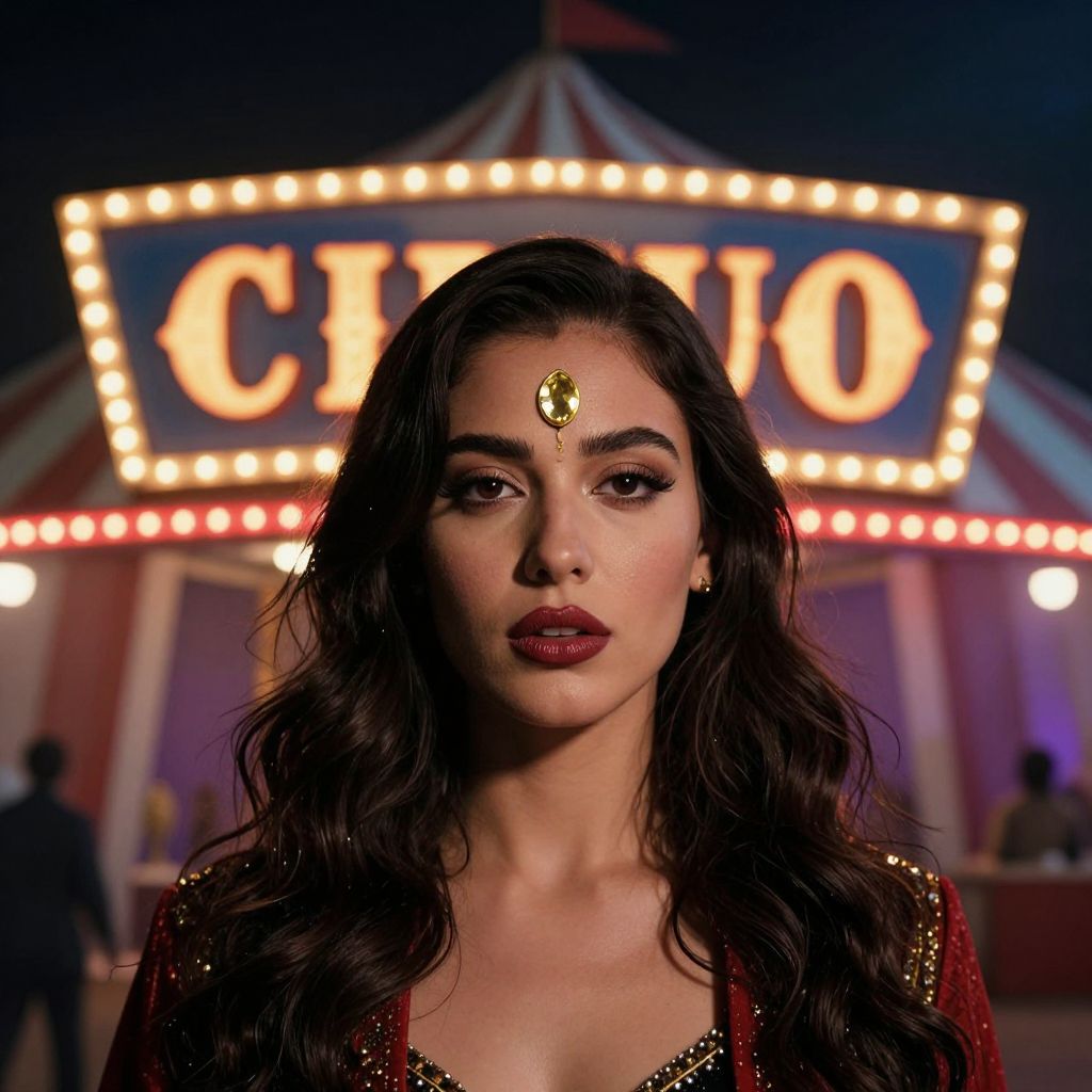 A woman with a golden gem on her forehead stands in front of a circus sign, surrounded by vibrant neon lights and a dramatic, cinematic atmosphere.