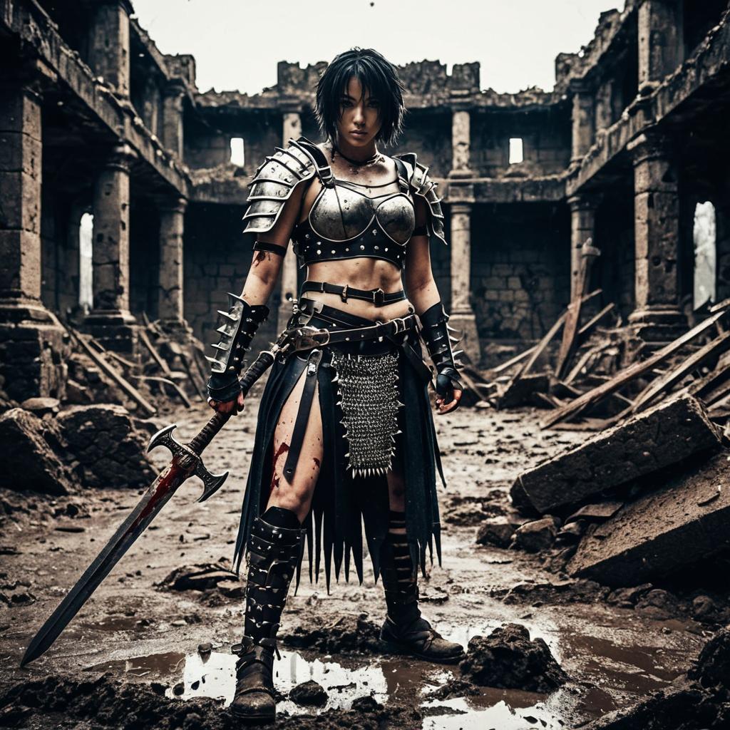 A fierce female gladiator stands in a dilapidated, muddy ancient arena surrounded by ruined stone structures. She is dressed in a spiked riot harness, chainmail skirt, and gladiator-style boots. Holding a bloodied spiked mace, her short black hair and intense expression convey strength and determination. The scene captures a gritty, chaotic atmosphere reminiscent of anime by Q Hayashida.