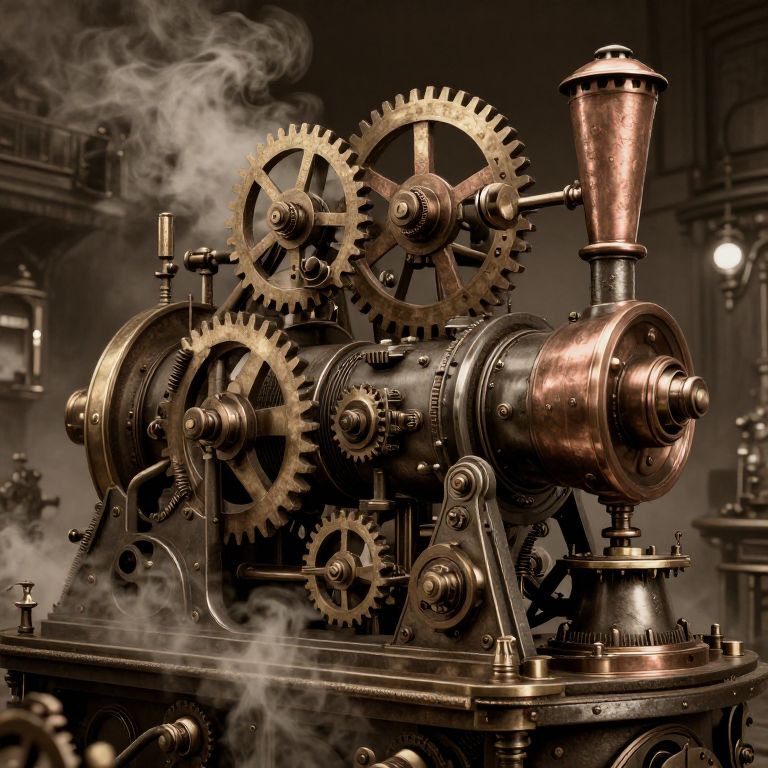 Showodnw in a steampunk world, surrounded by gears and steam-powered machinery, sepia tones mixed with copper and brass details, atmospheric smoke effects, Victorian-era design influence, detailed mechanical textures