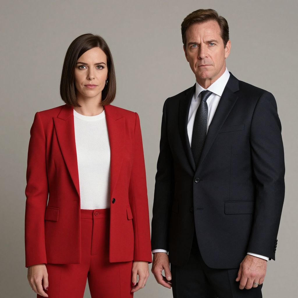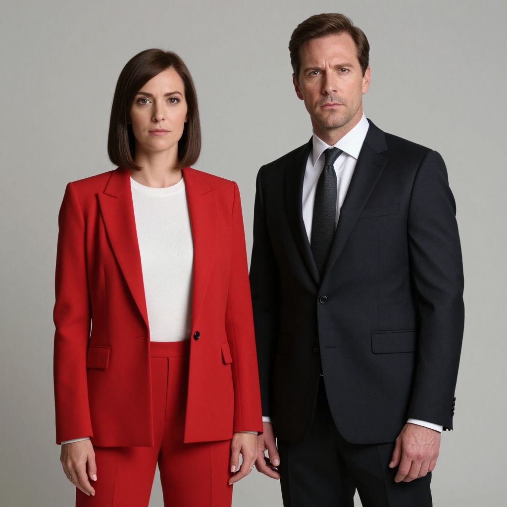 Two cast members from *Money Heist* Season 4 stand side by side, featuring a woman in a vibrant red blazer over a white sweater and a man in a sleek black suit with a tie, both exuding a serious and intense demeanor against a neutral background.