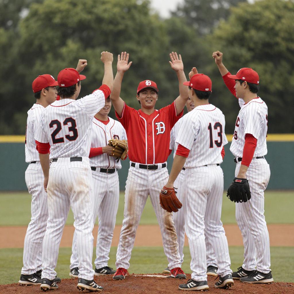 Photograph of a Little League game. Female player in front, intense expression, holding black bat, red knee-high socks, white uniform, red cap. Male player behind, raising arm, white uniform, red cap. Other players in background, similar attire. Dirt field in foreground, bench and spectators in background.