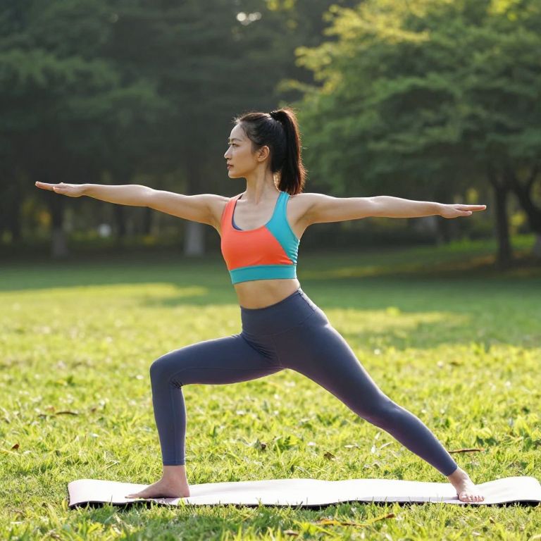 Sporty look with a colorful seamless bralette paired with matching leggings during an outdoor yoga session in a lush green park, morning light casting gentle shadows, capturing movement and energy with a vibrant and fresh aesthetic.