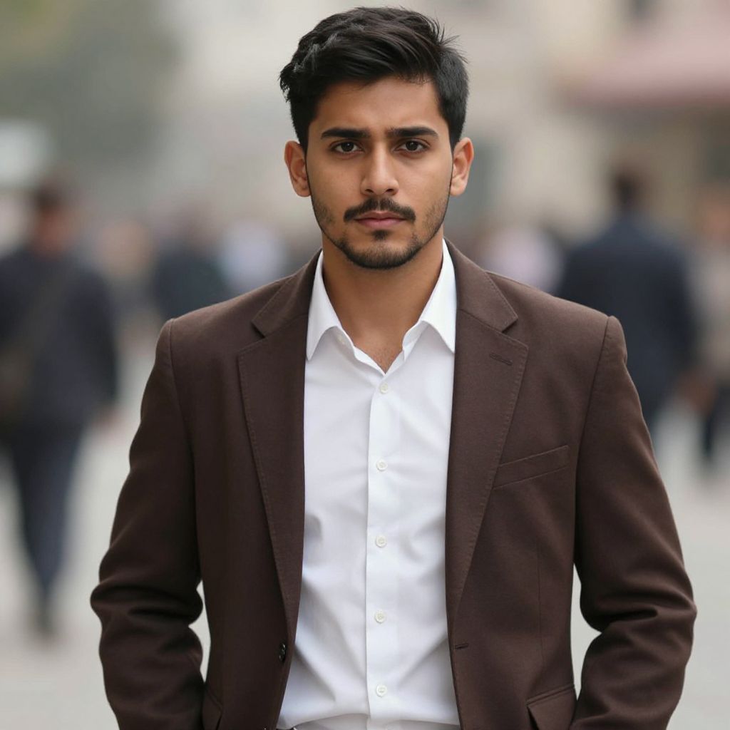 Photograph of a young South Asian man with short black hair and trimmed beard, wearing an orange vest over a white shirt, standing in a blurred,