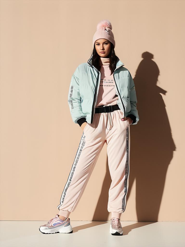 Woman, athleisure with a trendy twist, light pink turtleneck top with text print, matching pink tracksuit with geometric patterns, elastic waistband with black belt and silver buckle, cuffed ankles, metallic iridescent sneakers, puffer jacket slung over one shoulder, beanie hat, white studio background. --sref 1400