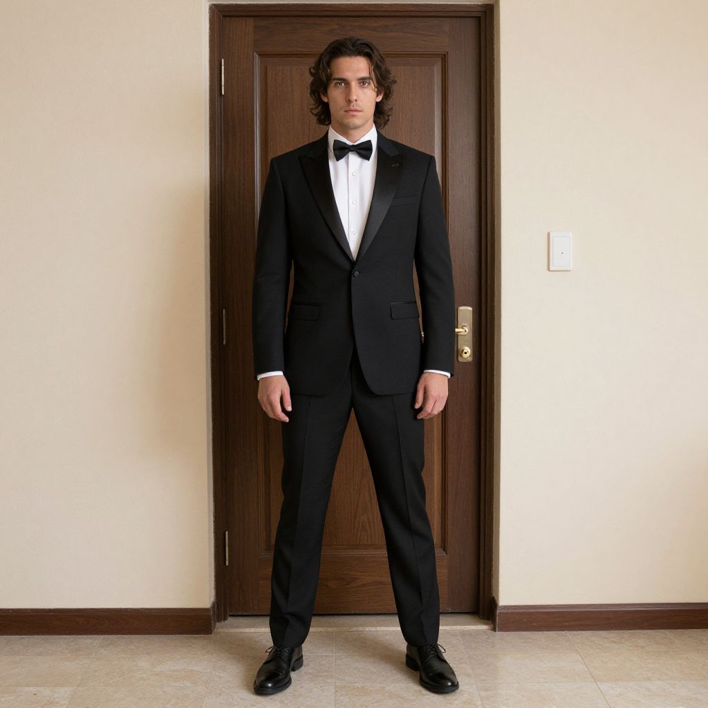 Photograph of a tall, slender man with medium-length curly dark brown hair, standing in front of a wooden door with a brass handle. He wears a black tuxedo with a white dress shirt and a black bow tie. His black dress shoes are polished, and he stands with his arms slightly relaxed at his sides. The background features cream-colored walls and beige tiled flooring. The man's expression is neutral, and he looks directly at the camera. The lighting is even, highlighting the formal attire and clean setting.