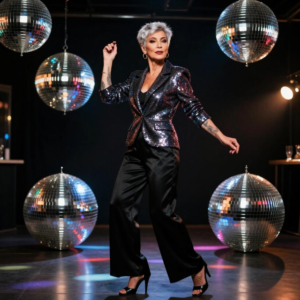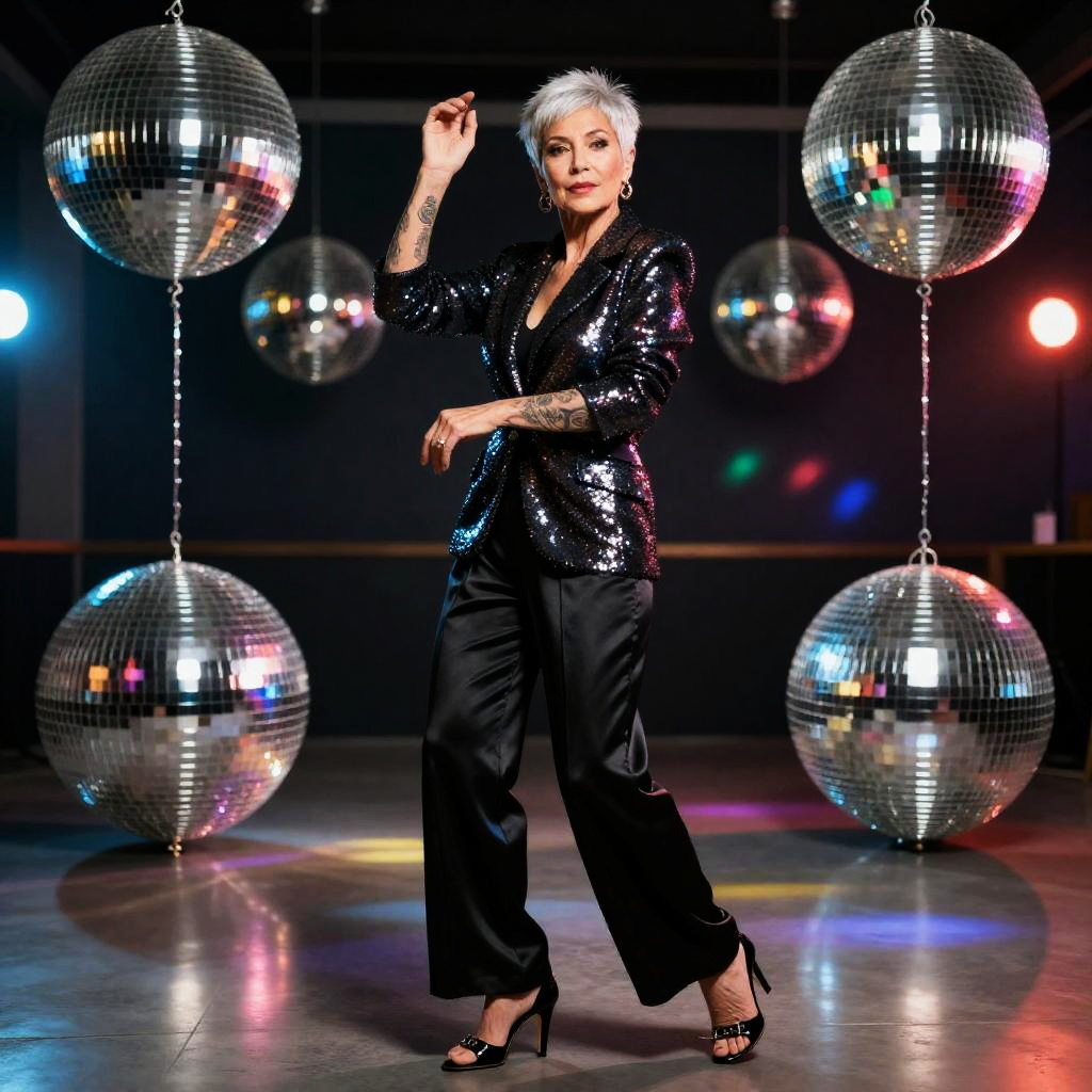 A 55-year-old woman with a silver pixie cut and intricate sleeve tattoos, wearing a vintage sequined blazer, silk wide-leg trousers, and statement heels, dancing at a retro mirrored disco hall with spinning mirror balls and colorful strobe lights, surrounded by colorful lights, highly detailed, 8k resolution, sharp, professional, clear, high contrast, high saturated, vivid deep blacks, crystal clear.