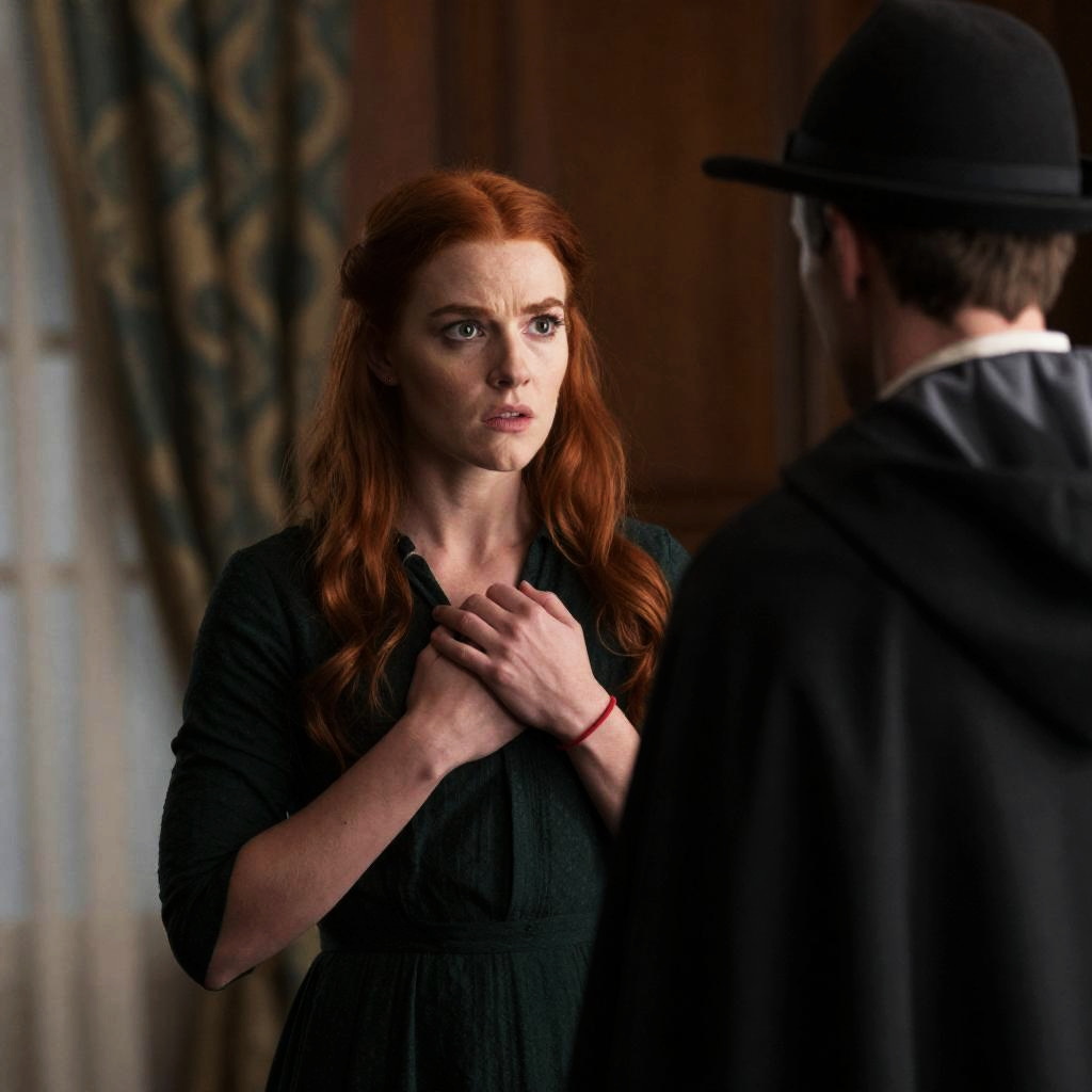 Photograph of a tense scene with a redheaded woman in a ured, dark green dress, gripping her chest. She has intense, determined eyes. A man in a dark hat and cloak, with his back to the camera, faces her. Patterned curtains and a wooden wall are in the background. The man's cloak has a gray lining. The woman's red wristband is visible. The man's face is not shown.