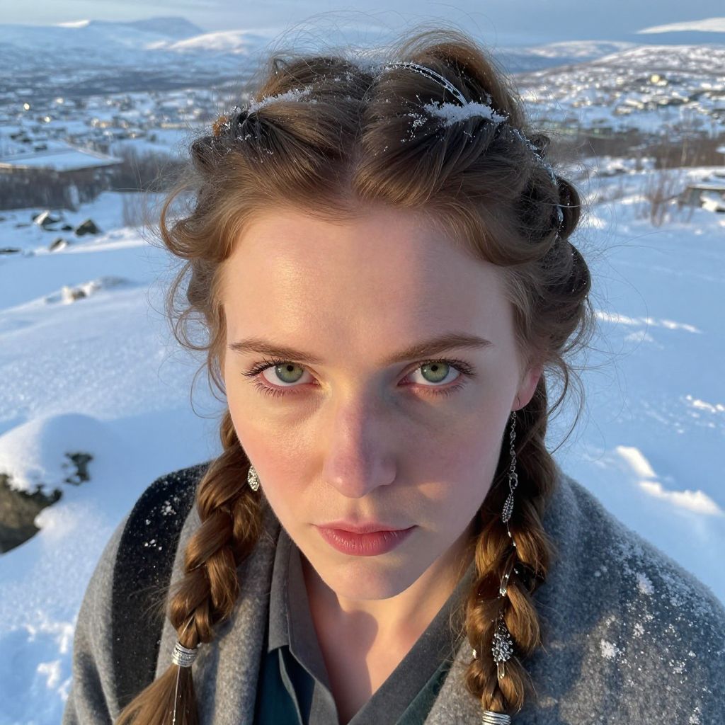 Imagine a portrait, captured from an unusual high-angle perspective by a smartphone camera, that showcases the enigmatic gaze of a Nordic woman with striking green eyes and porcelain skin. Set against a tranquil Scandinavian winter landscape, she stands amidst freshly fallen snow, looking down directly at the viewer. The soft, golden light of midday illuminates her face, casting intricate shadows that accentuate every delicate detail of her features and intricate braided hair adorned with silver accessories. This ultrarealistic portrait, fused with an impressionist landscape, evokes a sense of contemplative beauty and inner strength. The abstract blend of ethereal elements and tangible textures enhances her captivating presence, creating an enchanting effect as if she has emerged from the serene backdrop.