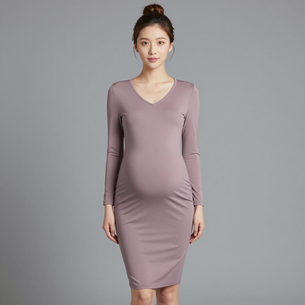 Costume pregnant moms, photograph of pregnant woman, standing, gray background, wearing teal hooded dress, beige short-sleeve top, blue skirt, hands on belly, brown hair, casual style, blue sneakers, soft lighting, centered, relaxed expression, studio shot, realistic style, no additional objects