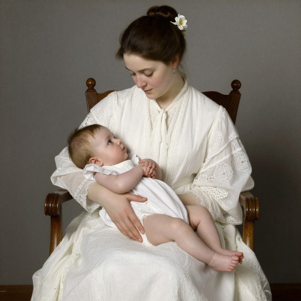 Susan Comforting the Baby (no.1), a renowned work by Mary Stevenson Cassatt, depicts a tender moment where a woman, adorned in a flowing white dress with delicate lace trim, sits gracefully on a wooden chair while cradling a baby in her arms. The woman's hair is neatly styled in a bun with a white flower accessory, and she wears subtle jewelry, including earrings. The baby, dressed in a matching white outfit with frilled sleeves, rests comfortably against her, its small hands gently clasped together. The composition captures a serene and intimate interaction, set against a muted background that emphasizes the warmth and affection between the figures.