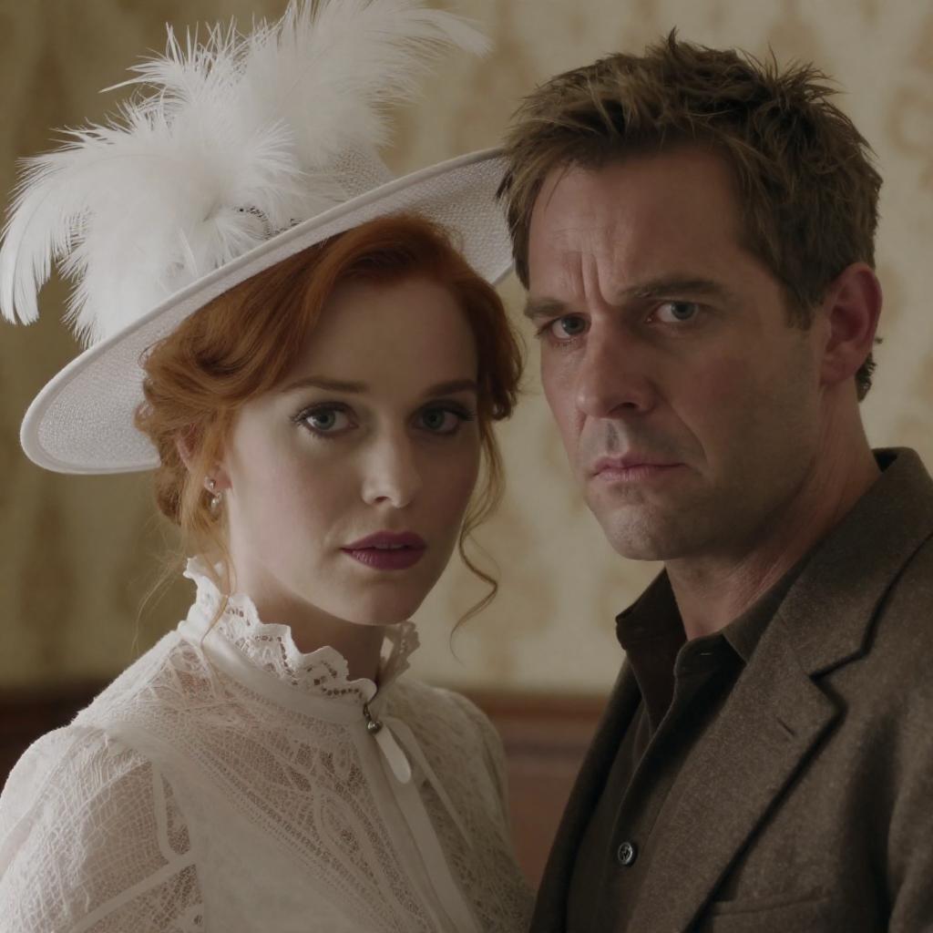 Photograph of a man and woman in close proximity. The man has rugged features, short brown hair, and a slightly gruff expression. The woman has red hair, wears a large white feathered hat, and has a focused expression. She wears a lace-collared blouse. The man is in a brown shirt, and they are indoors with patterned wallpaper in the background. The woman's face is closer to the camera, slightly turned to the right. Both have intense expressions.