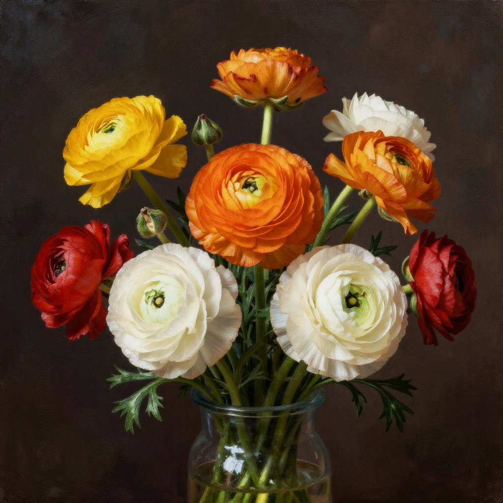 A radiant portrait of a bouquet of ranunculus in the style of Delacroix, rich colors and soft lighting