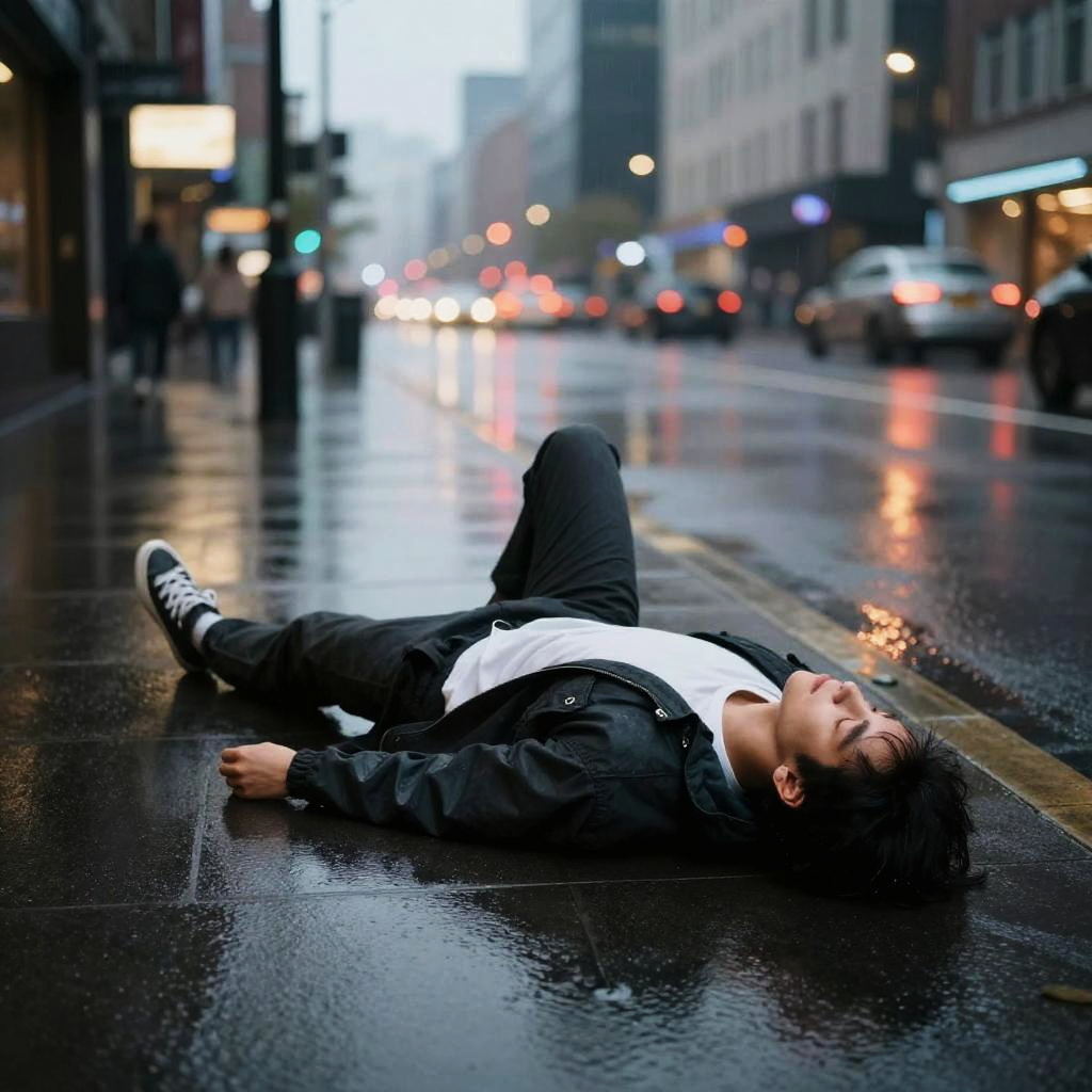 Person lying on ground on an urban street at dusk, neon lights reflecting on wet pavement, casual clothes, contemplative mood, cinematic atmosphere with rain and cityscape backdrop