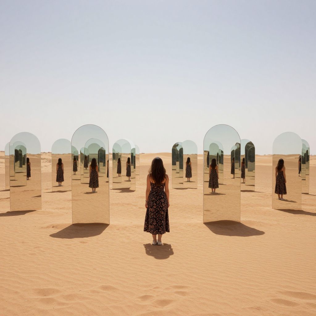 In a vast desert, a woman stands amidst an endless array of arch-shaped mirrors, each reflecting her figure in infinite loops, creating a surreal tapestry of repetition and introspection.