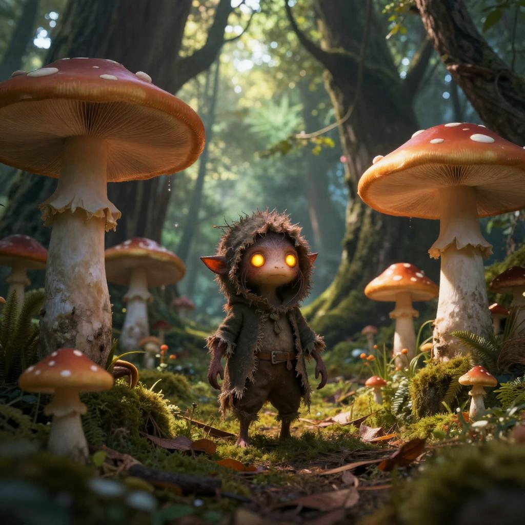 CGI forest scene: small, glowing-eyed, furry creature with tattered clothes stands among large, red-and-white spotted mushrooms, surrounded by lush green