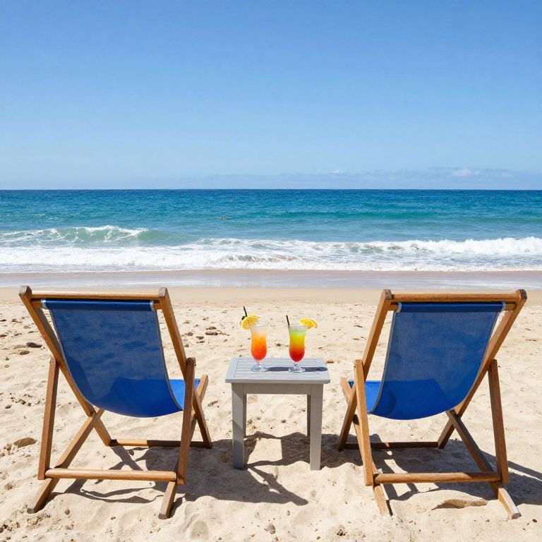 High Dynamic Range (Hdr) 2 deck chairs overlooking the beach, cocktails on a table, blue ocean, waves, sunny day,