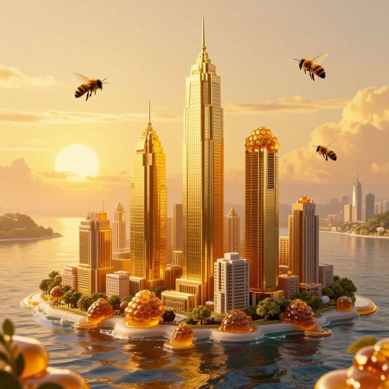 Golden skyscrapers gleam like enormous beehives as they rise majestically above an island city, surrounded by an ocean of gelatinous honey that swallows the landscape, while bees flutter gracefully against the backdrop of a radiant golden sunset.