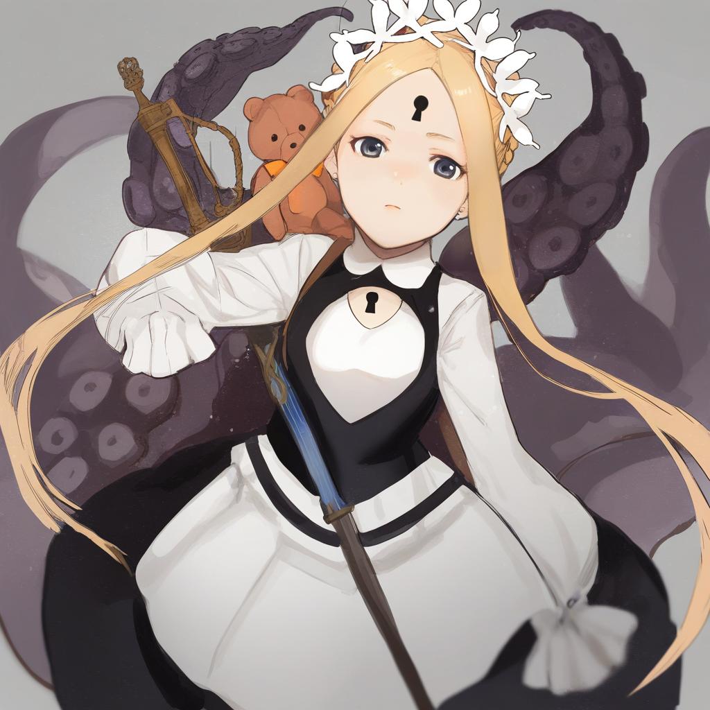 Abigail williams (festival outfit) (fate), fate/grand order, 1girl, maid headdress, blue eyes, blonde hair, very long hair, long hair, butterfly hair ornament, parted bangs, sidelocks, braid, small breasts, black dress, white shirt, black skirt, white dress, sleeves past fingers, long sleeves, forehead, tentacles, teddy bear, keyhole, by artist hiranko, leet