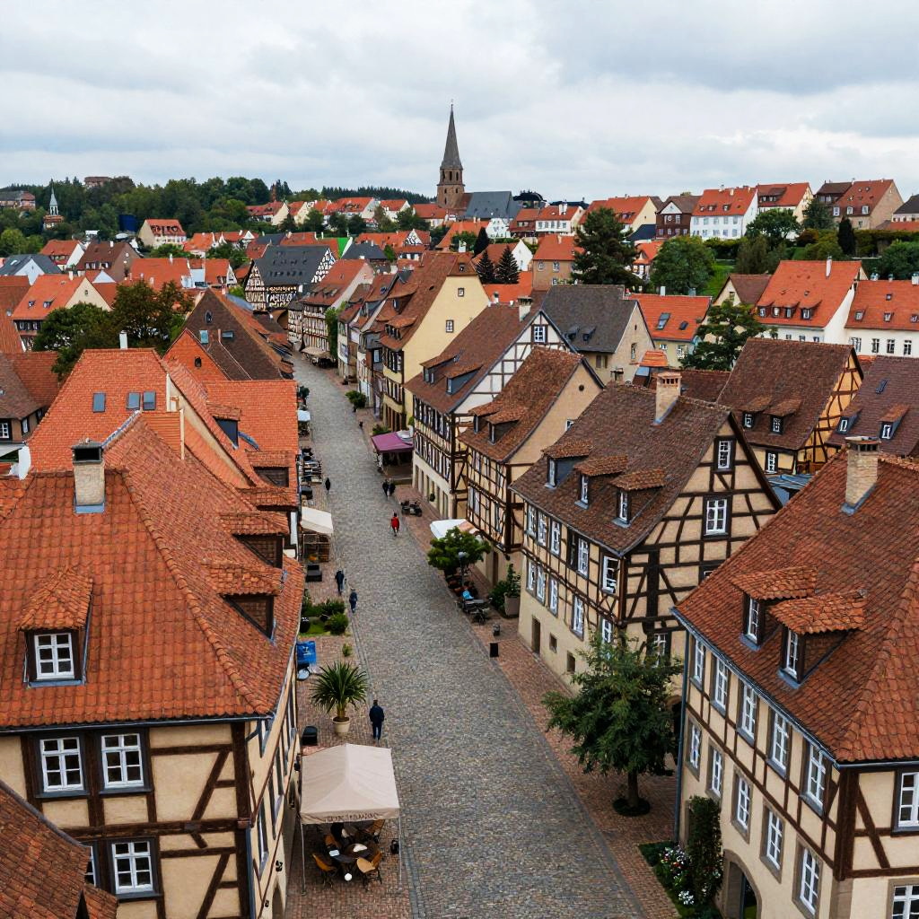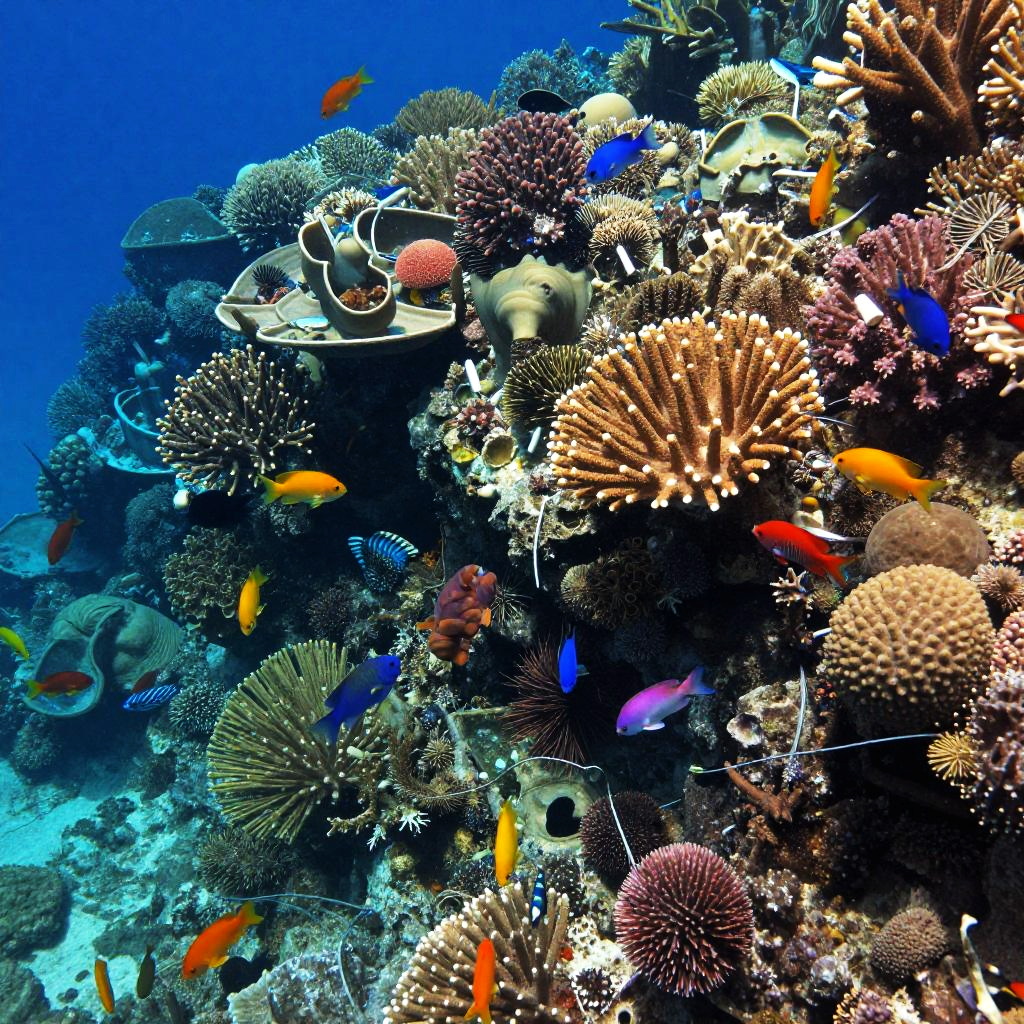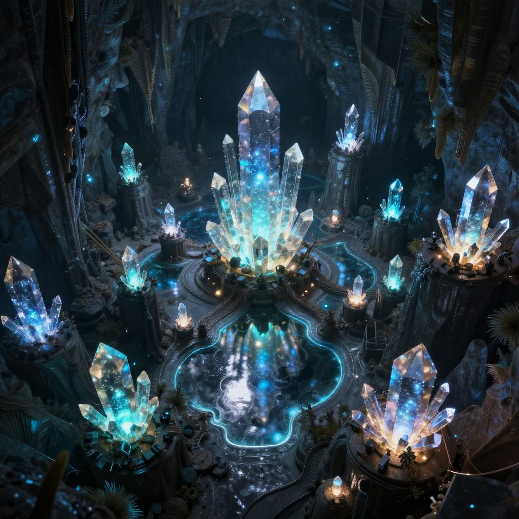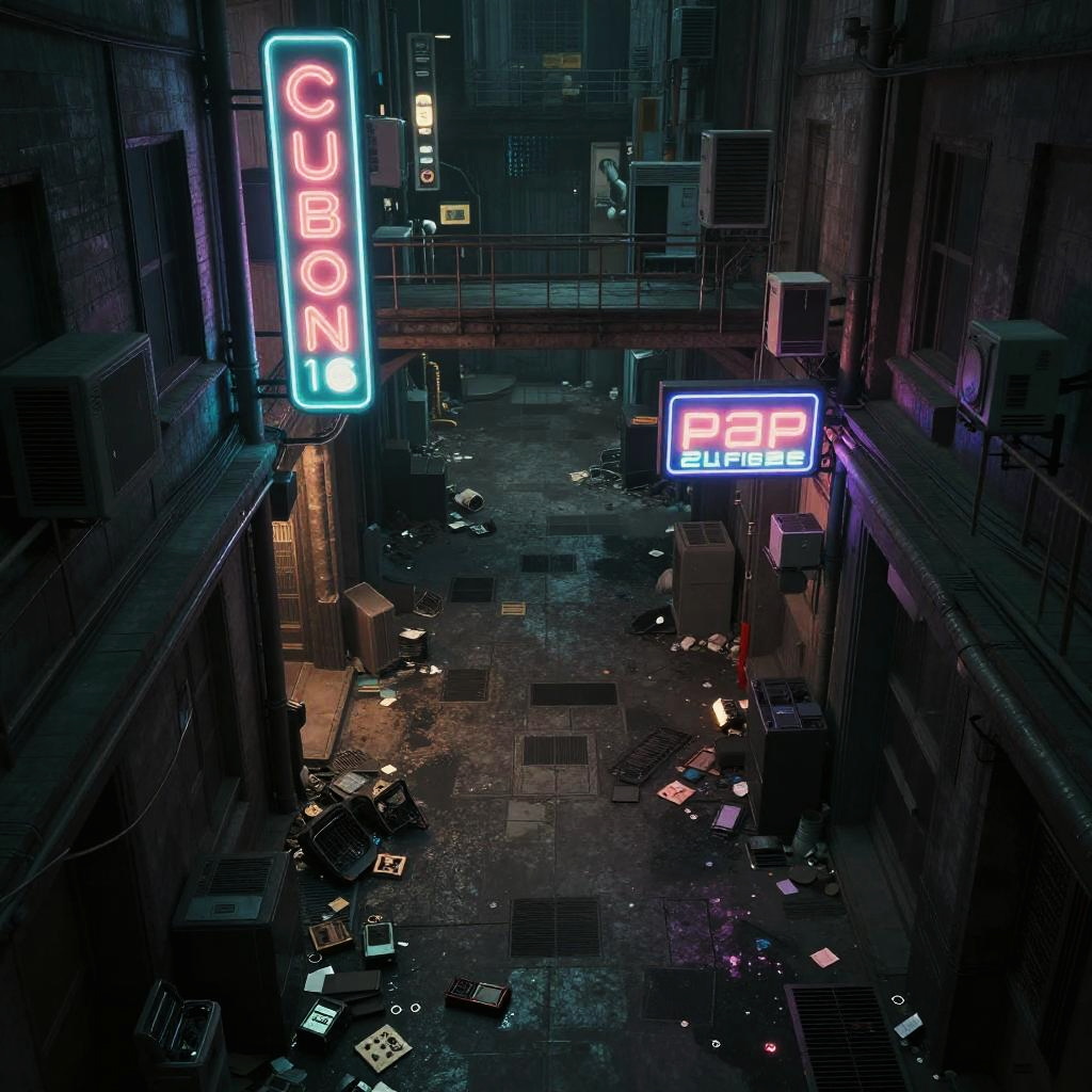 An deserted cyberpunk alley, viewed from above. neon signs, scattered tech debris.