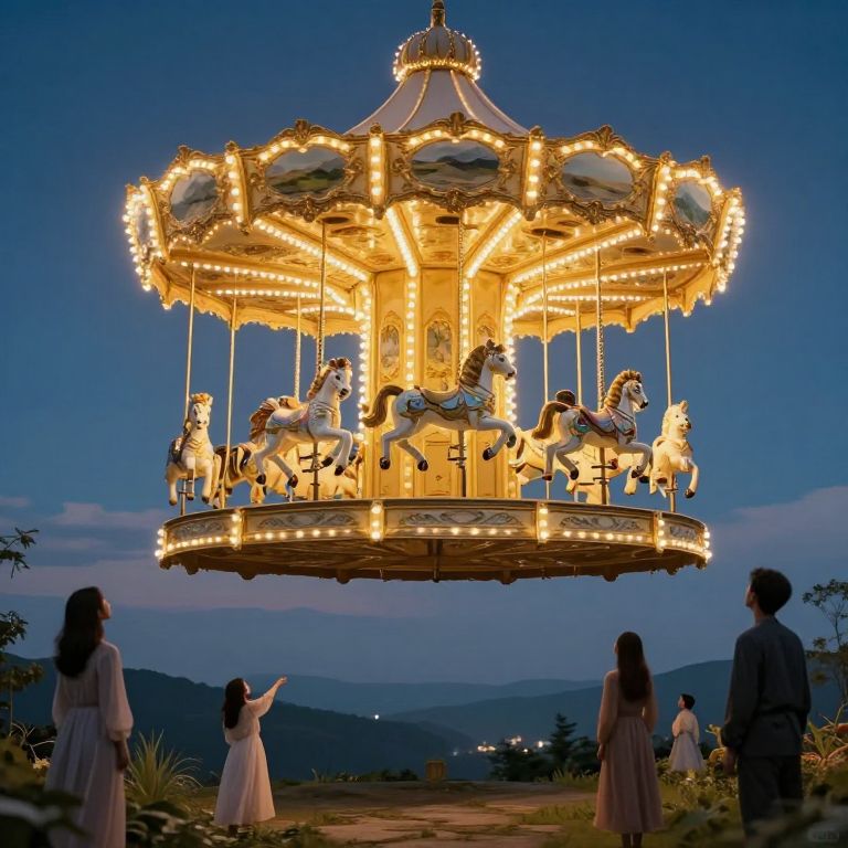 Suspended between earth and sky, a golden carousel spins serenely, its riders cloaked in ethereal light, as figures below gaze upward in awe, their hearts stirred by the timeless dance of wonder and mystery.
